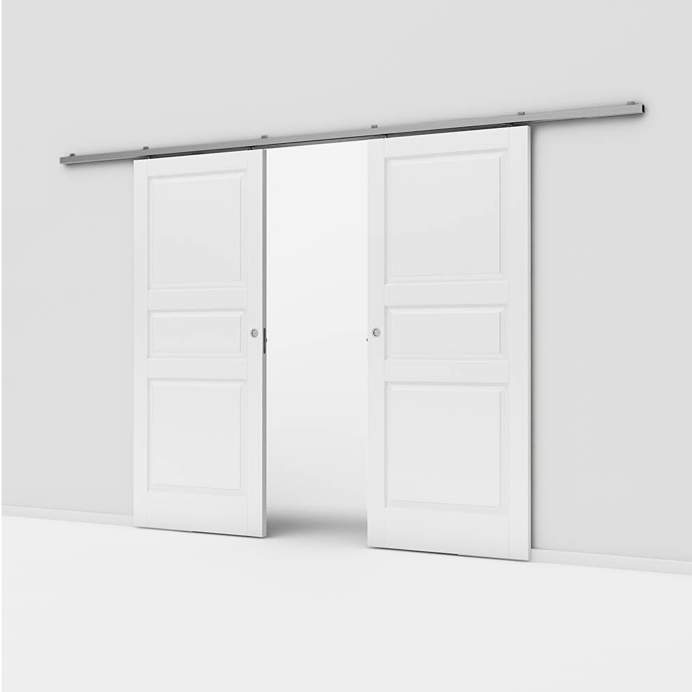 Sættet består af 2 stk. Finland kompakt/massiv skydedøre og en 3 meter skinne til at skrue på væggen, som døren glider i. Du køber derfor et sæt bestående af 2 døre og en skinne. Vore skydedøre er alle massive/ kompakte. Hjulene køre bedre på skinnen pga. vægten og produktet er mere holdbart, end hvis du vælger en celledør som skydedør.