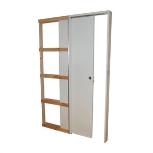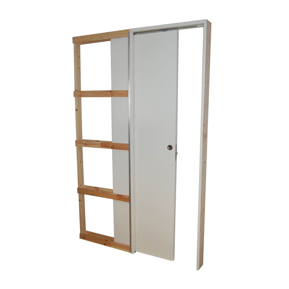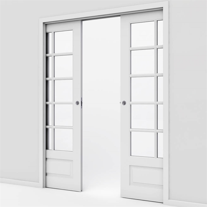 Sættet består af 2 stk. massive London skydedøre og en 95/120 mm. indbygningskarm. Du køber derfor et sæt bestående af 2 døre og 1 karm. Træ-skelettet er 95 mm. og beklædes med gips, som giver væggen en samlet tykkelse på 120 mm. - Derfor navnet "95/120".