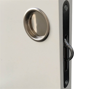 En skydedør med indbygningskarm, bygges ind i væggen, så døren ikke optager så meget plads. Alternativt kan skydedøren monteres uden på væggen - se vores udvalg af udenpåliggende skydedøre.