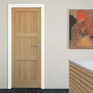 Dørens er i familie med vores Kvadrat 3 glasdør og hvide Kvadrat 3 fyldningsdør og er 4 cm tyk. En enorm flot og elegant dør med 3 felter - og nu tilbyder vi den som her i eg, men vi har den også i både hvid og sort her på nettet. Virkelig flot kvalitetsdør. Døren har ikke glaslister monteret rundt om glasset - vi syntes det er langt det pæneste. Det er en massiv dør, hvilket også betyder, at den har 25 dB lyddæmpning. Døren her leveres i eg. Karmen kan enten leveres i eg eller hvid alt efter ønske.