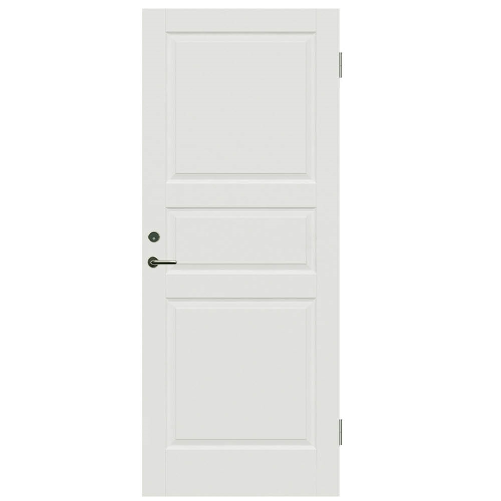 Døren er opbygget med en fyrtræsramme, 3 mm glat fiberplade, og med en kompakt rørspånkerne. Hængslerne er 3248-110 (Hamborghængsler) og døren leveres med låsekasse 565. Døren er forberedt til cylinderlås/vrider