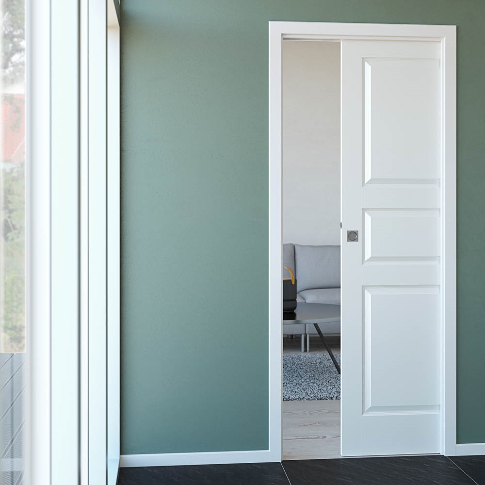 Indbygnings-skelettet er enten 75 eller 100 mm og beklædes med gips på begge sider. Vægtykkelsen ender derfor ud i enten 100 mm eller 125 mm. Indbygningsmodulet har både tætningslister og gummilæber, som skydedøren lukker ind imod.