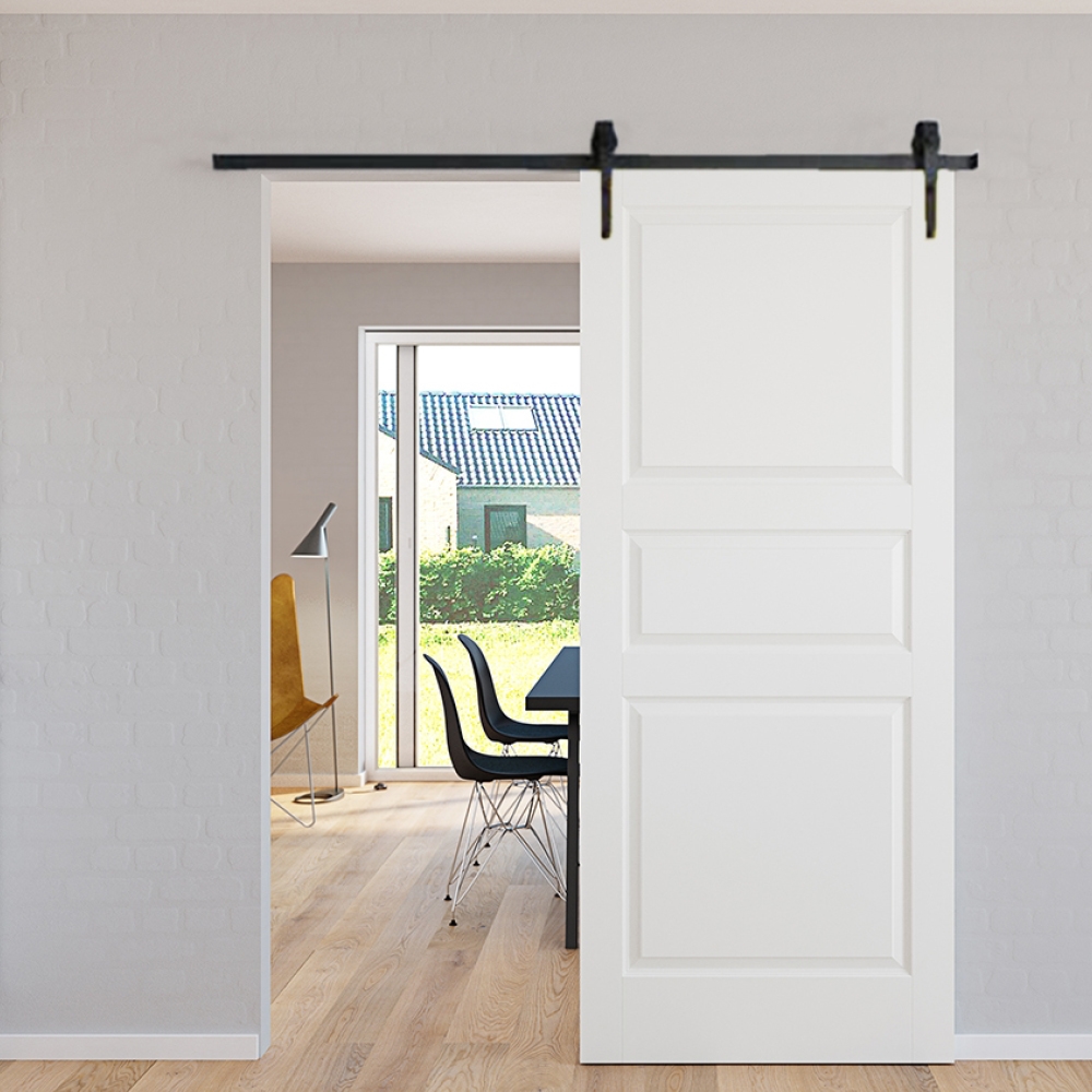 Denne eksklusive skydedørsløsning købes som sæt bestående af en Finland kompakt skydedør, samt et 2 meter langt pulverlakeret mat sort retro beslag. Sættet udtrykker et flot look og vil fremstår fantastisk flot i hjemmet.