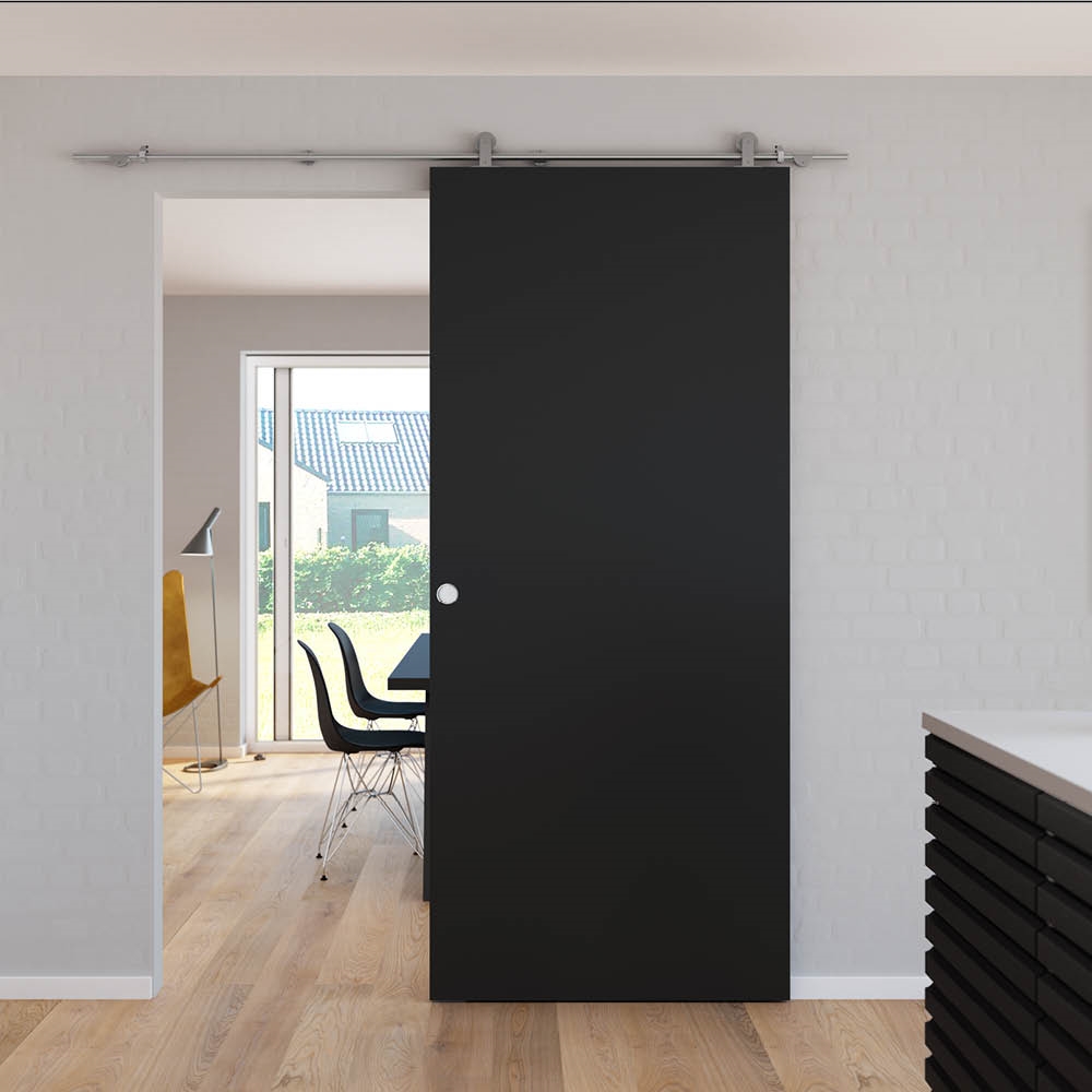Komplet pakkeløsning inkl. kompakt/massiv dør i farven sort og 2 meter rustfri stålskinne