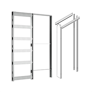 Sættet består af en glat kompakt skydedør samt en indbygningskarm med børstelister til enten 100 mm eller 125 mm færdig vægtykkelse (1 lag gips på begge sider).
