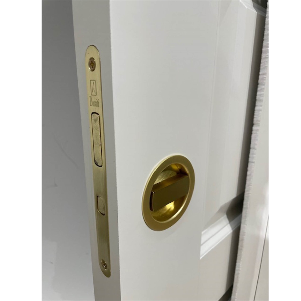 Lås til skydedør, rund design hagelås m/vrider, messing, isat