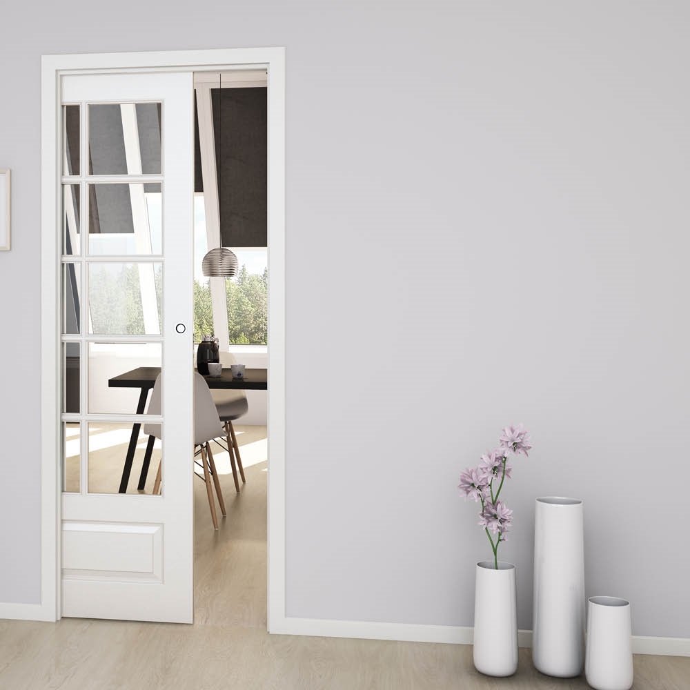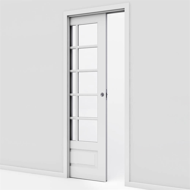 En skydedør med indbygningskarm, bygges ind i væggen, så døren ikke optager så meget plads. Alternativt kan skydedøren monteres uden på væggen - se vores udvalg af udenpåliggende skydedøre.