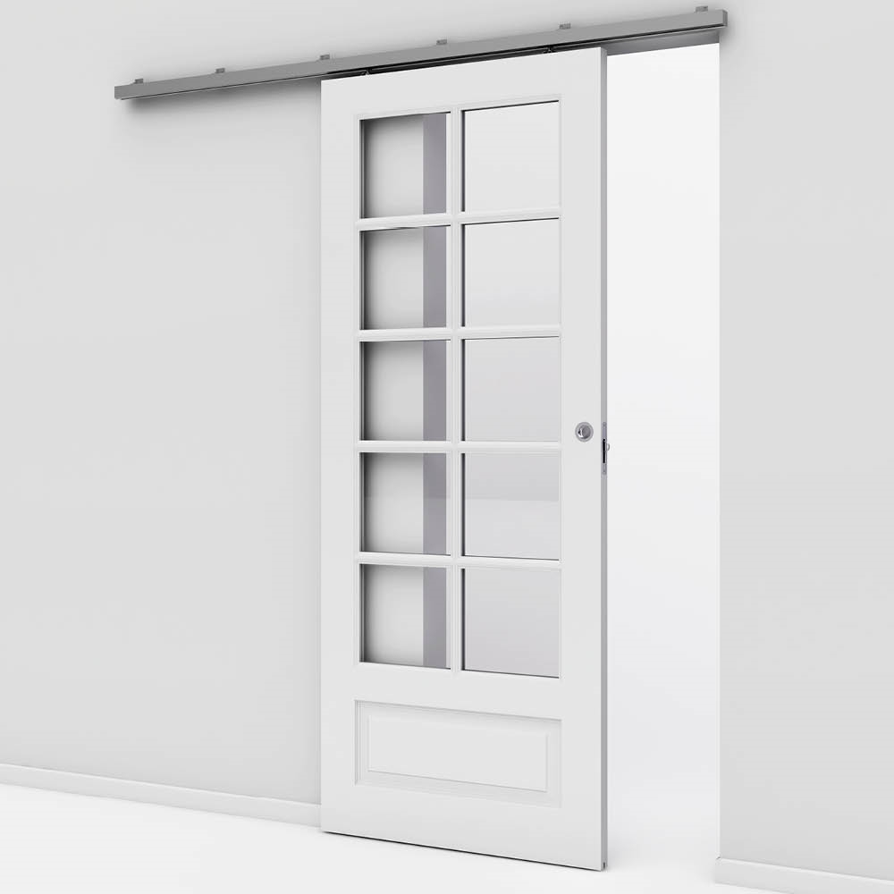 Sættet består af en massiv skydedør i model London og en 2 meter lang skinne til at skrue på væggen, som døren glider i. Du køber derfor et sæt bestående af 1 dør og 1 skinne.