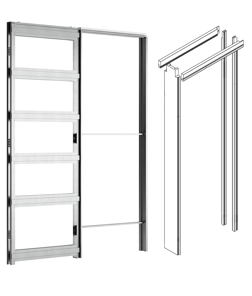 Sættet består af en London kompakt skydedør samt en indbygningskarm med børstelister til enten 100 mm eller 125 mm færdig vægtykkelse (1 lag gips på begge sider).