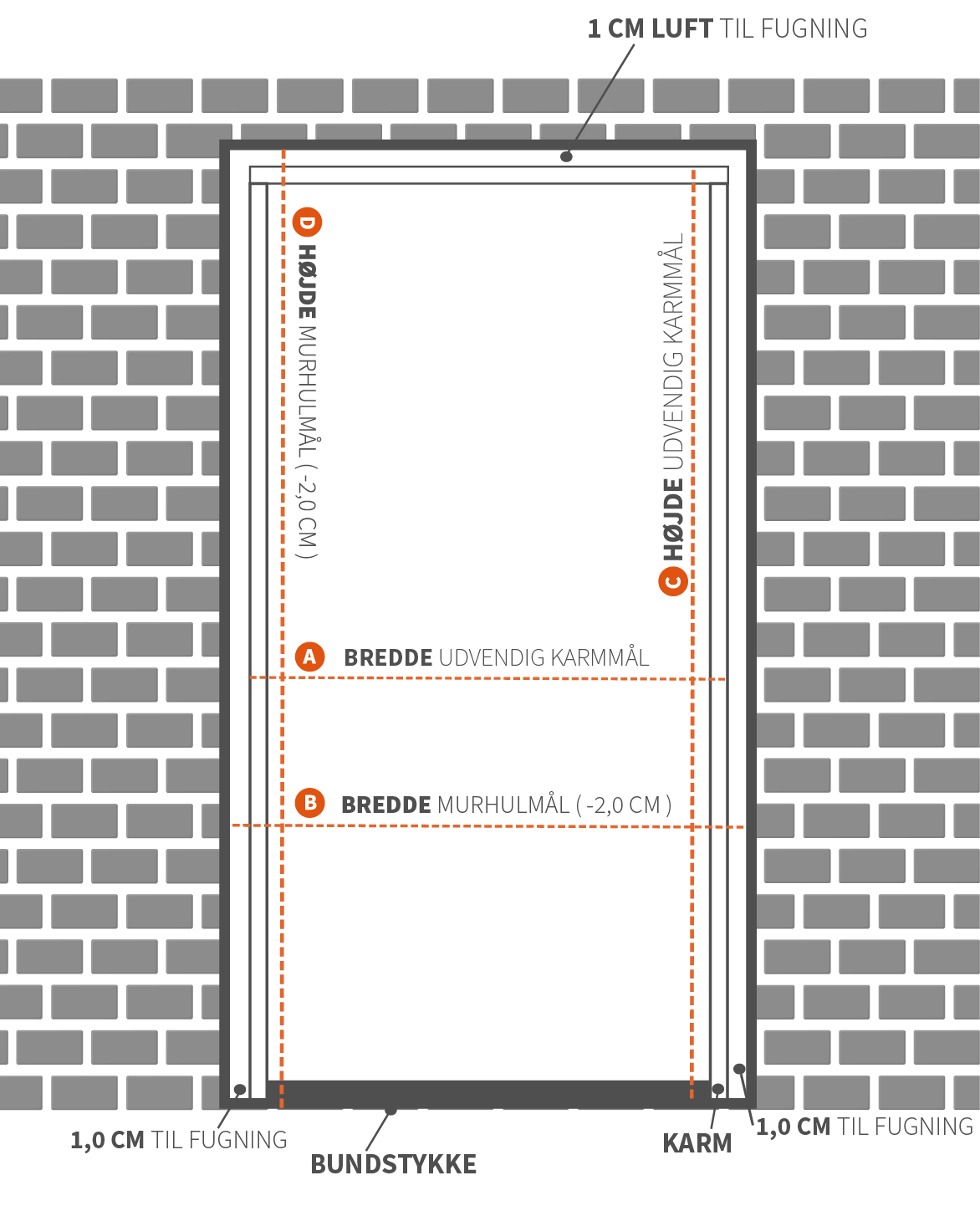 En generel regel er, at der bør være 2- 2,5 cm (ca 1 cm på hver side) luft i bredden og ca. 1 cm i højden målt fra karmens yderside og ud til muren.